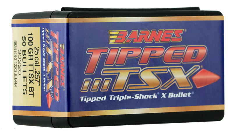 Barnes Tipped TSX (TTSX) bullets are copper solid construction, lead-free reloading projectiles designed for rifle hunting applications. These .257" diameter, 100 grain boat tail bullets feature a polymer tip that increases ballistic coefficient and a cannelure for secure seating. The design delivers rapid expansion with four razor-sharp petals upon impact, offering effective performance on large game.