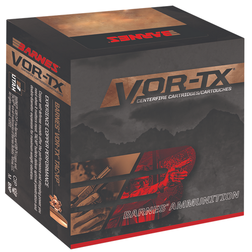 Barnes Bullets VOR-TX 45 Auto ammunition features 185 grain TAC-XP hollow point bullets designed for tactical and self-defense applications. These lead-free rounds deliver 1060 fps muzzle velocity and 462 ft-lbs of energy, with deep penetration and controlled expansion. Comes in boxes of 20 rounds with brass casings and Boxer primers.