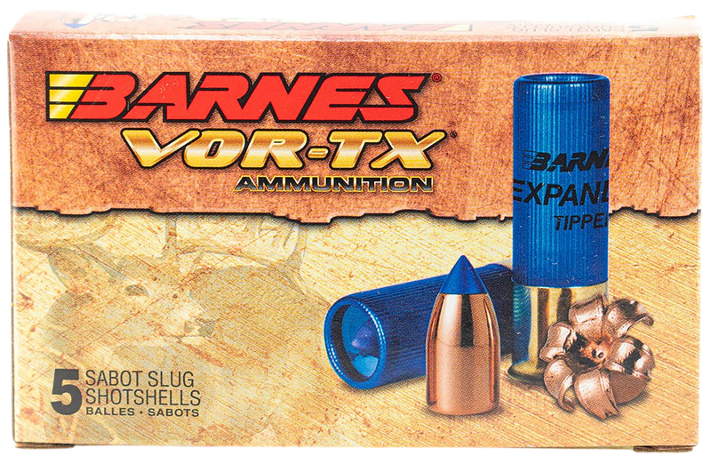 Barnes VOR-TX shotshell slugs in 12 gauge 2.75" feature a 438-grain all-copper expander tip design that delivers rifle-like accuracy and performance for hunting. The polymer-tipped slug achieves 1450 fps muzzle velocity with excellent expansion, weight retention, and deep penetration for taking down game humanely and effectively.
