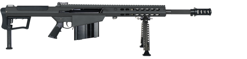 The Barrett M107A1 is a semi-automatic rifle chambered in 50 BMG with a 20" chrome-lined fluted barrel and four-port cylindrical muzzle brake. This optics-ready platform features an anodized aluminum receiver, A2 polymer grip, and flip-up rear sights, weighing 27.4 lbs with an overall length of 54". Designed for long-range precision shooting, it combines reliability with the power of the 50 BMG cartridge.