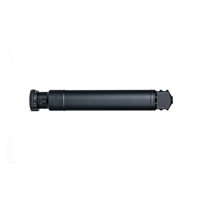 Quick-detach suppressor designed for the Barrett M107A1, Model 99, and Model 95 rifles chambered in .50 BMG. Constructed from heat-treated 4130 steel with a 2.5" diameter and 14.84" overall length, it achieves approximately 23 dB sound reduction and weighs 4.88 lbs. Mounts via a 1/4-turn lock ring system that indexes over the muzzle brake for guaranteed alignment.
