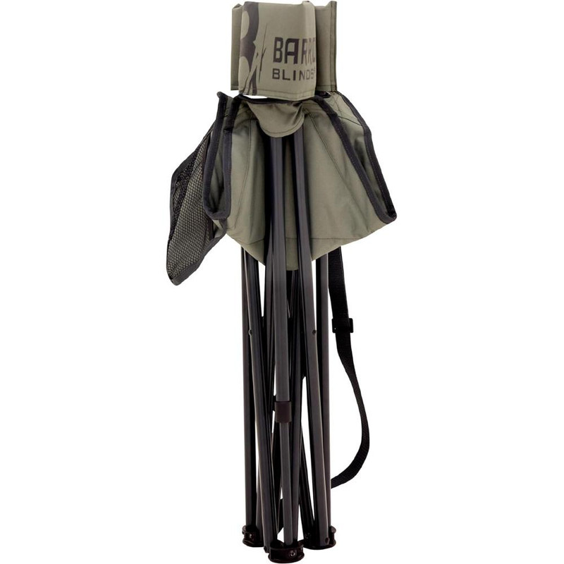 Lightweight aluminum chair designed for use inside hub blinds, weighing just 4 lbs with a 400 lb weight capacity. Features an 18" seat height with padded seat and backrest, plus a large side pocket for storage and carry strap for transport.