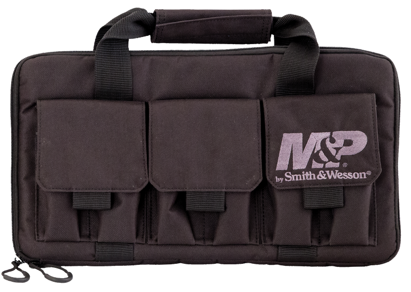The M&P Pro Tac Handgun Case is designed to securely hold two handguns with padded internal pistol pockets that accommodate revolvers with barrels up to 8 inches. Constructed from durable ballistic nylon fabric with thick nylon strapping, it features three double magazine pouches with hook and loop closures. Exterior dimensions are 15.5" x 10.5" x 4" with foam padding throughout.