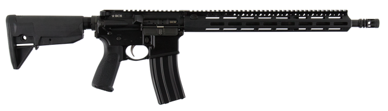 The BCM RECCE-16 MCMR is a semi-automatic AR-15 style rifle chambered in 5.56 NATO/.223 Rem with a 16" government profile steel barrel and 30rd capacity. The 7075-T6 aluminum receiver features hard coat anodized finish with manganese phosphate barrel treatment, mid-length gas system, and includes a Mod 0 compensator, 6-position collapsible stock, Bravo Mod 3 grip, ambidextrous safety, and M-LOK free float handguard. Weighs 6.10 lbs with an overall length range of 32.5" to 35.5".