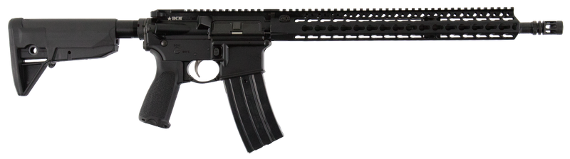 Semi-automatic AR-15 platform rifle chambered in 5.56 NATO/.223 Remington with a 16" steel government profile barrel featuring a 1:7 twist rate. Features Bravo Company's KMR-A KeyMod handguard, MOD 0 compensator, ambidextrous safety, PNT trigger, and optic-ready receiver; ships with 30+1 capacity magazine and weighs 6.10 lbs.