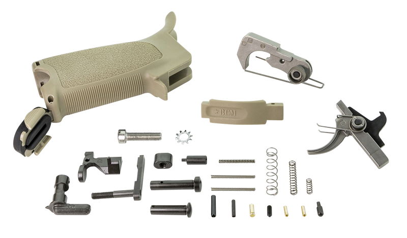 BCM Enhanced lower parts kit for AR-15 platforms featuring a BCMGunfighter polymer grip in Flat Dark Earth finish. Includes polished nickel Teflon trigger. Complete kit for 5.56 NATO/.223 Remington AR-15 builds.