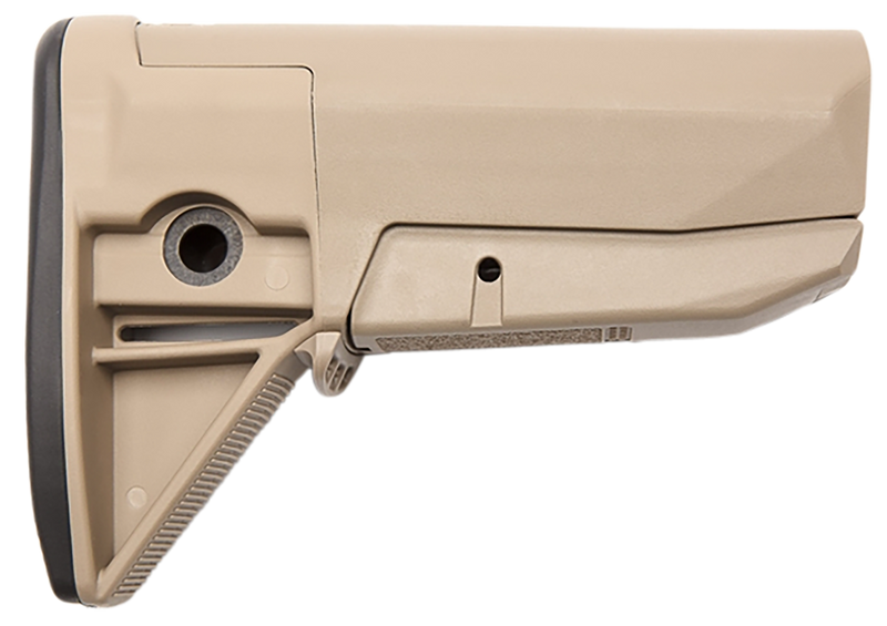 Complete AR-15 rifle stock assembly kit featuring a polymer construction in Flat Dark Earth finish. Includes stock tube and measures 10.3" in length with a 5.4" width and 3.1" height. This mil-spec compatible stock installs on standard AR-platform receivers and is designed for ergonomic control and durability.