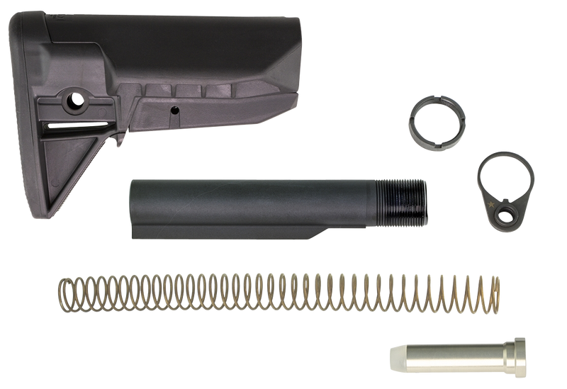 The BCM BCMGunfighter Mod 0 Stock Kit is a complete stock assembly designed for AR-15 platforms, featuring a SOPMOD widebody cheekweld for improved ergonomics and sight picture. This polymer stock kit includes a receiver extension, quick detach end plate, lock nut, action spring, and carbine buffer. Dimensions are approximately 10.3" length x 5.4" width x 3.0" height.