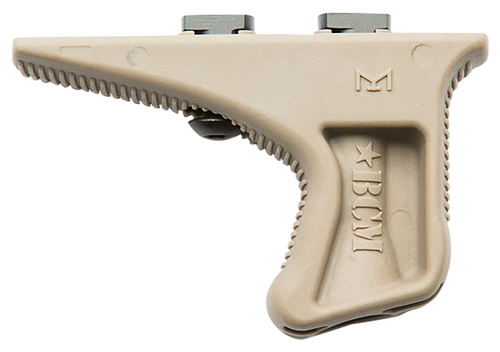 The BCM KAG1913FDE is a polymer angled grip designed for Picatinny rails with a textured Flat Dark Earth finish. This foregrip measures 3.3" in length, 2.7" in width, and 1.2" in height, providing ergonomic control and mounting directly to standard 1913 Picatinny rail systems. The kinesthetic design enhances weapon handling and target acquisition.