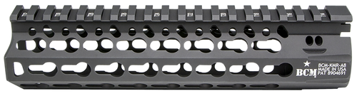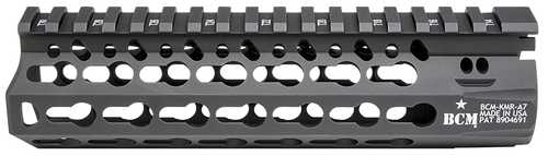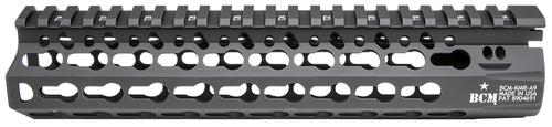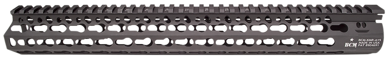 The BCM KMR Alpha is a 15-inch free-floating aluminum handguard designed for AR-15 rifles, featuring a black anodized finish and Keymod mounting system. It includes a BCM Keymod sling mount and BCM Keymod nylon rail for accessory attachment. The handguard measures 19.9 inches in overall length with a 2.9-inch width and 2.8-inch height for ergonomic handling.
