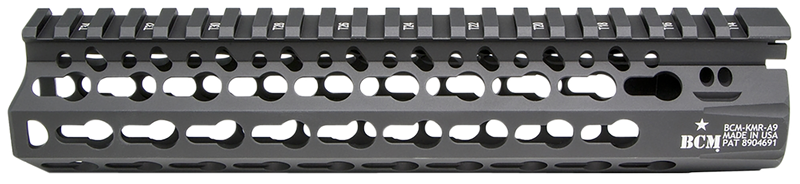 The BCM KMR Alpha is a 9-inch free-floating handguard designed for AR-15 rifles, constructed from aluminum with a black anodized finish. It features Keymod mounting slots for accessories and measures 2.9" in width and 2.8" in height, providing a lightweight mounting platform with four mounting positions.