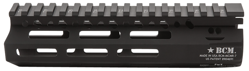 The BCM MCMR is a 7-inch free-floating modular handguard designed for AR-15 and AR platform rifles, featuring M-LOK mounting slots for tactical accessories. Constructed from lightweight aluminum with a black anodized finish, it measures 2.8 inches in width and height. The handguard uses a drop-in design for easy installation without requiring special tools.