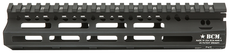 The BCM MCMR is a 9-inch free-floating modular handguard designed for AR-15 and AR-platform rifles, constructed from aluminum with black anodized finish. Features M-LOK attachment slots for mounting accessories and measures 2.8 inches in width and height. Direct installation on AR-pattern upper receivers without gunsmithing required.