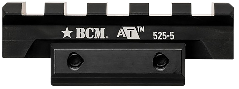 The BCM A/T Optic Riser 525-5 is a Picatinny rail-mounted riser that elevates optics by 0.525 inches. Constructed from anodized aluminum in black, this accessory measures 2.125 inches long and is designed to provide proper sight height for AR-platform rifles. No rings are included; this is a mounting base only.