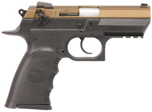 The Baby Eagle III Semi-Compact is a double/single action semi-auto pistol chambered in 40 S&W with a 3.85" barrel and 12+1 capacity. Features include a polymer frame, carbon steel slide with Black Cherry Cerakote finish, white 3-dot combat sights, ambidextrous slide decocker and magazine catch, and a tactical rail. Weighs 25 oz. and measures 7.8" overall.