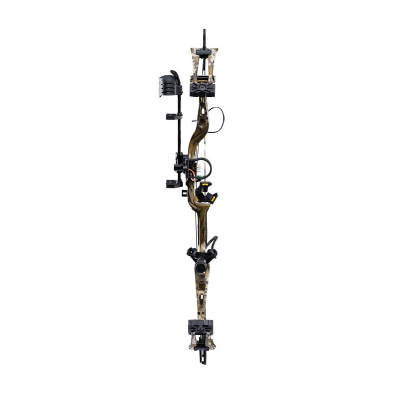 Ready-to-hunt compound bow featuring a 55-70 lbs draw weight, adjustable 24-31" draw length, and up to 320 fps velocity with 80% let-off. Includes Trophy Ridge IMS V-Biscuit rest, 4-pin sight, peep sight, 5-arrow quiver, stabilizer, and wrist sling. Designed through collaboration with The Hunting Public for real-world hunting performance.