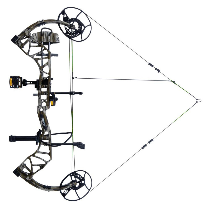 Right-hand compound bow with adjustable draw weight of 55-70 lbs and draw length of 27-32 inches, delivering arrows at up to 330 feet per second. Features an 80% let-off, 6.5-inch brace height, carbon glass limb construction, and comes RTH (Ready to Hunt) with 4-pin sight, peep sight, 5-arrow quiver, and sling included. Built in the USA by Bear Archery with Mossy Oak Bottomland camouflage finish and backed by a manufacturer limited lifetime warranty.