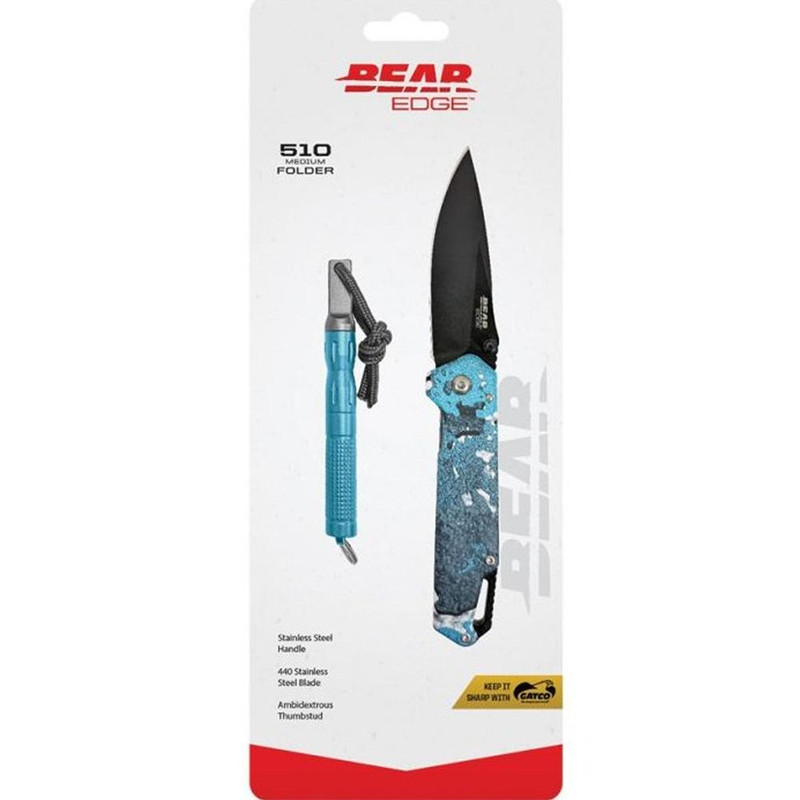The Bear Edge Brisk 1.0 is a lightweight daily-carry folding knife featuring a 3-inch 440 stainless steel drop point blade with a tactical black-coated finish for durability and corrosion resistance. One-handed deployment is enabled by a flipper tab that locks securely with a stainless framelock, making it suitable for heavy use. The knife has a Zytel handle with a True Timber Rif camo pattern and an overall length of 7-1/2 inches.