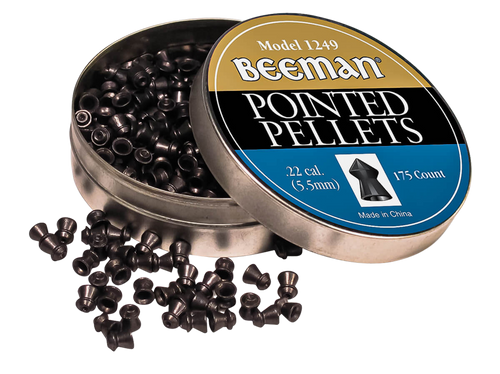 Beeman Model 1225 pointed pellets in 177 caliber are made from lead and designed for air rifle use. Each tin contains 250 pellets weighing 8.56 grains. The pointed design provides improved aerodynamics for enhanced accuracy and range.