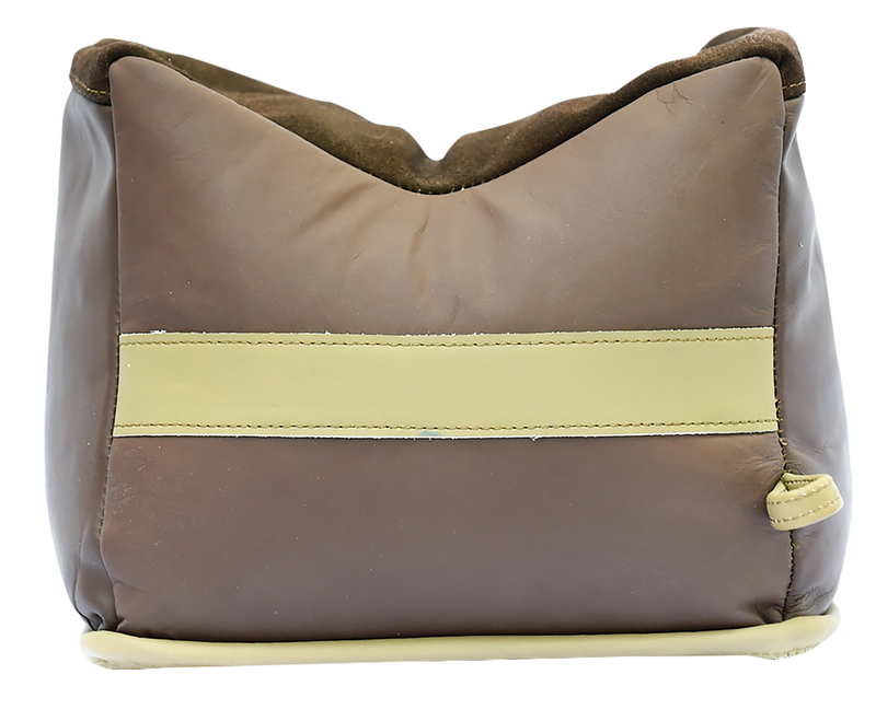 This unfilled bench bag is designed as a front rest for rifle shooting applications. Constructed from brown leather and weighing 0.55 lbs, it provides a stable shooting platform when filled with sand or other material. Dimensions are 9.75" x 6.28" x 7.75".
