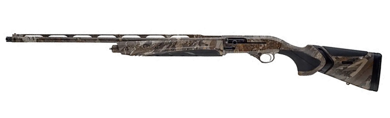 Left-hand 12 gauge semi-auto shotgun with 3.5" chamber and 28" Steelium Plus ventilated rib barrel. Features Optifade Timber Camo finish, Kick-Off MEGA recoil reduction system, and Optima HP extended choke tubes (5 included). Weighs 7.4 lbs with fiber optic front sight and steel mid-bead.