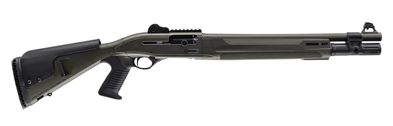 Semi-automatic tactical shotgun chambered in 12 Gauge 3" with an 18.5" barrel and 7+1 capacity. Features an aluminum receiver, synthetic pistol grip stock in Olive Drab Green, M-LOK forend, adjustable ghost ring sights, and BLINK gas operating system. Weighs 6.8 lbs with an overall length of 37.8" and includes Optima HP Improved Cylinder choke, drilled and tapped for optics.
