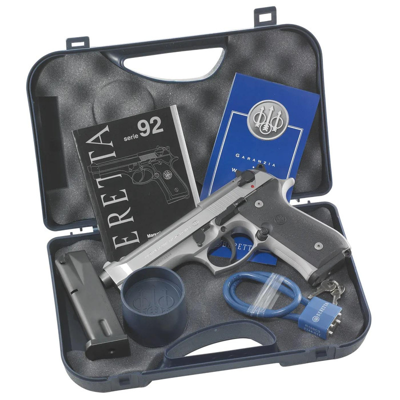 The Beretta 92FS Inox is a 9mm semi-automatic pistol with a 4.9" barrel and 15+1 round capacity, featuring a stainless steel slide and barrel paired with an anodized alloy frame for durability and corrosion resistance. This model includes fixed sights, black plastic grips, and comes with two 15-round magazines and a hard case. Weighing 33.3 oz with an overall length of 8.5", it is the legendary platform used as the official U.S. military sidearm for over 35 years.