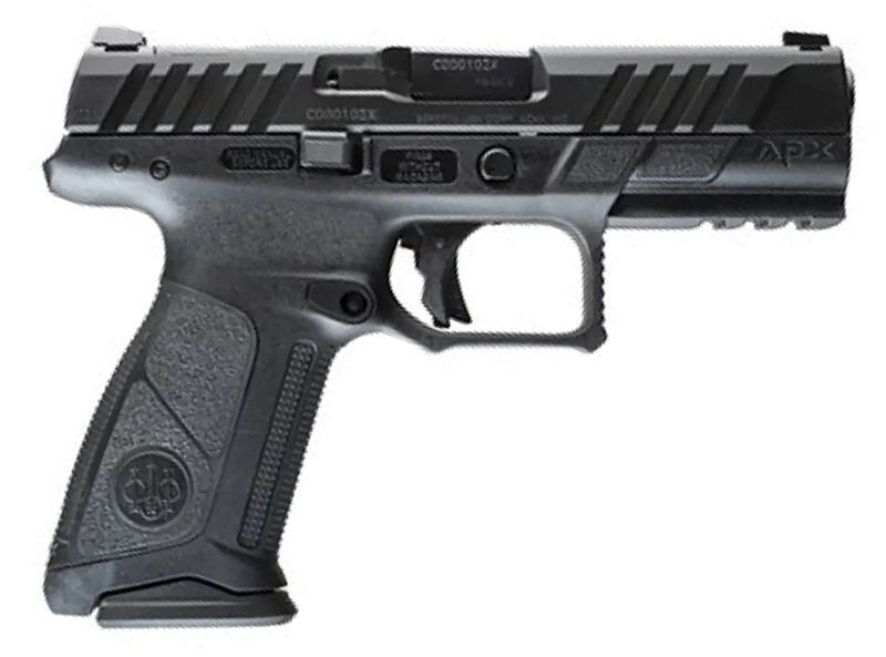 The Beretta APX A1 Full Size is a striker-fired 9mm pistol with a 4.25" barrel and 17+1 round capacity. Features an optic-ready serrated slide, polymer frame with Picatinny rail, interchangeable backstrap grips, and ambidextrous controls. Weighs 29.6 oz unloaded and measures 8.2" overall length.