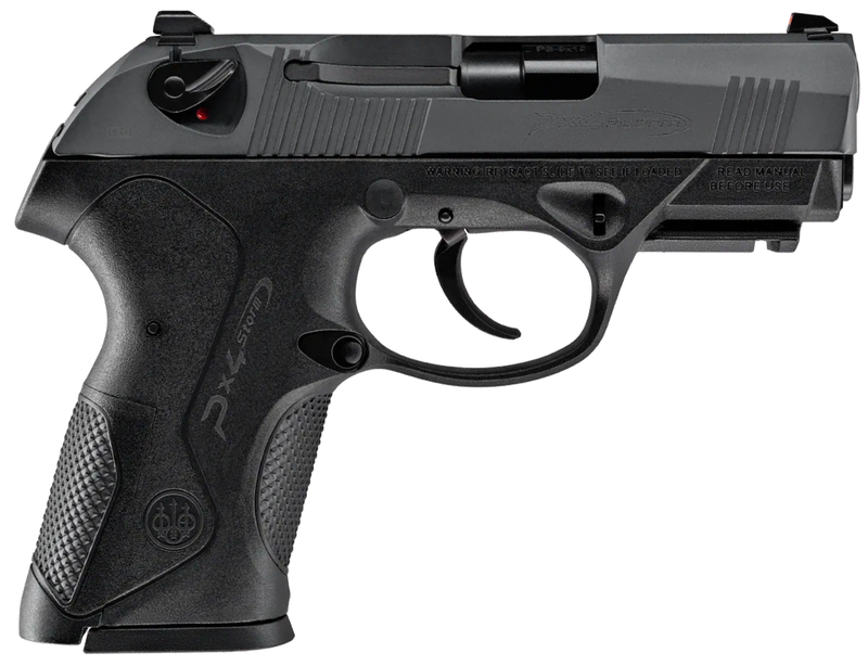 The Beretta PX4 G Compact Carry is a 9mm Luger semi-automatic pistol with a 3.2" heavy contour rotating barrel and 15+1 capacity. Features a DA/SA action, black Bruniton serrated steel slide, black polymer frame with Picatinny rail, and fixed 3-dot sights. The rotating barrel system reduces recoil for improved control in a compact carry package weighing 27.3 oz.