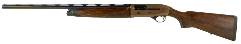 Semi-automatic 12 gauge shotgun with 28" ventilated rib barrel and 3" chamber. Features a bronze-toned aluminum receiver, walnut stock with Kick-Off recoil reduction system, fiber optic front sight, and Optima-Choke HP system with three choke tubes (F, M, IC). Left-hand configuration with crossbolt safety and chrome-plated trigger.