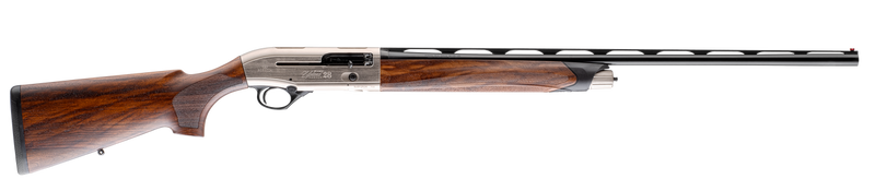 Semi-automatic 28 gauge shotgun with 3" chamber and 28" ventilated rib barrel. Features engraved silver receiver, walnut stock, fiber optic sights, and includes three Optima-Choke HP tubes (F, M, C). Weighs approximately 6.7 lbs with adjustable shim system for stock fit.