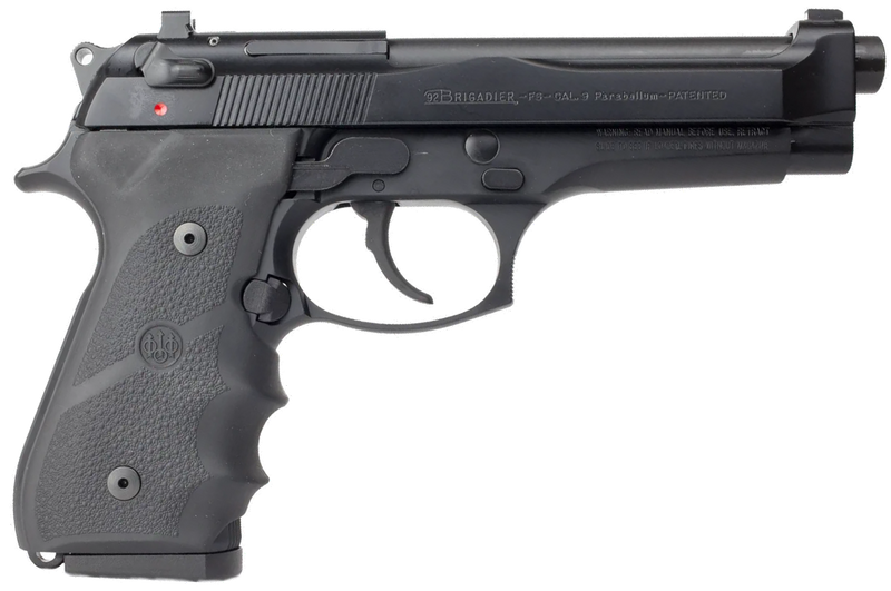 The Beretta 92FS Brigadier is a full-size semi-automatic pistol chambered in 9mm Luger with a 4.9" barrel and 15+1 capacity. Features double/single action with ambidextrous controls, fixed 3-dot sights, and black rubber wraparound grips. This classic combat pistol weighs 35.3 oz and measures 8.5" overall with a matte black finish and manual safety.