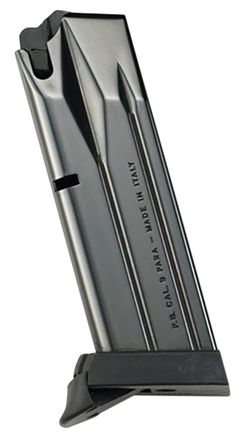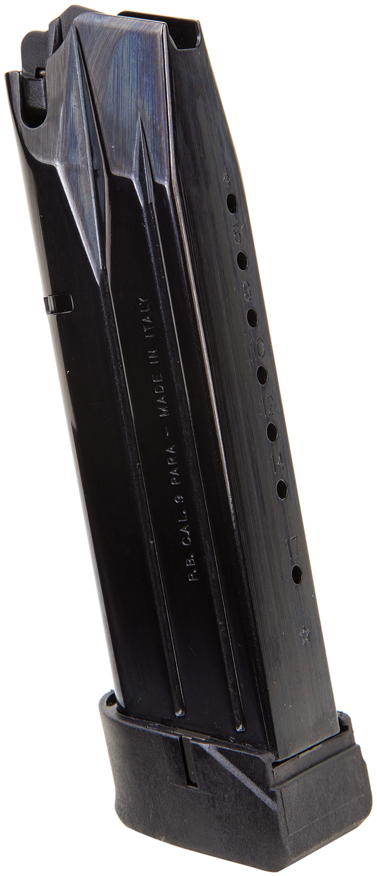 This is a 20-round extended magazine for the Beretta Px4 Storm chambered in 9mm Luger. Constructed from black steel with a blued finish, it provides increased ammunition capacity for extended shooting sessions.