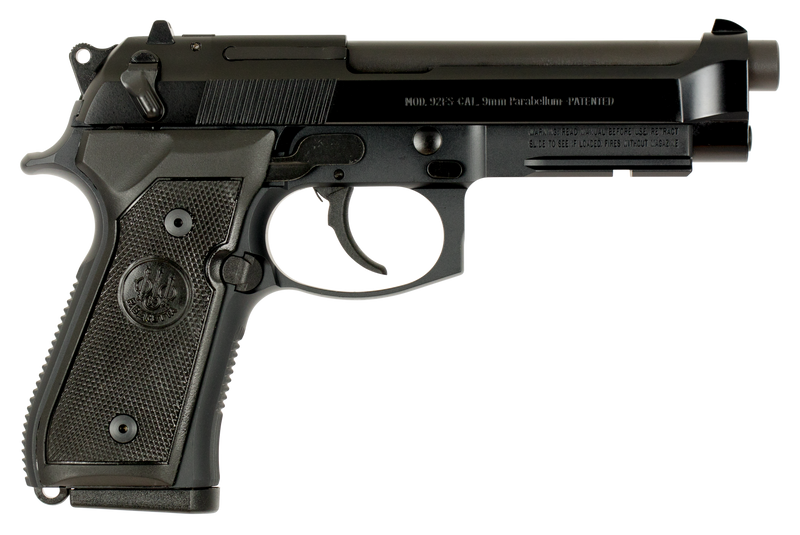 The Beretta M9A1 is a California-compliant 9mm Luger semi-automatic pistol with a 4.9" barrel and 10+1 round capacity. It features a double/single action trigger, black bruniton finish, aluminum alloy frame with Picatinny rail, and 3-dot contrast sights. Unloaded weight is 33.9 oz with an overall length of 8.5".