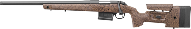 The Bergara B-14 HMR is a left-hand bolt-action rifle chambered in 7mm PRC with a 24" threaded barrel and 5+1 capacity. It features an integrated mini-chassis molded into the synthetic stock for repeatable bedding and accuracy, with a fully free-floated barrel, adjustable cheekpiece, length-of-pull spacers, and drilled/tapped receiver. The rifle weighs 9.7 lbs and comes with one 5-round AICS-style detachable magazine.