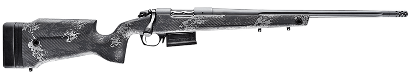 The Bergara B-14 Crest is a bolt-action rifle chambered in 6.5 PRC with a 20" fluted, threaded barrel (5/8x24) and 3+1 capacity. Features a 100% carbon fiber Monte Carlo stock with internal spine for rigidity, Sniper Gray Cerakote finish, and includes an Omni muzzle brake. This drilled and tapped rifle weighs approximately 7.2 lbs and has a 1:8" twist rate, delivering sub-MOA accuracy for mountain hunting and precision shooting.