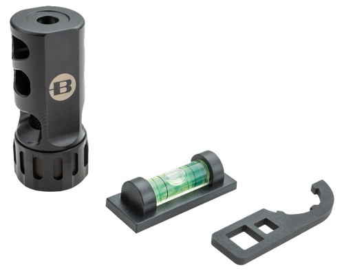 The Bergara ST-1 is a self-timing muzzle brake designed for .30 caliber rifles with 5/8"-24 threads. Constructed from 17-4 stainless steel with nitride finish, it features an angled baffle design that reduces felt recoil and muzzle rise while minimizing ground disturbance. The brake is 2.5" in length with a 1" diameter and includes a wrench and bubble level for installation.