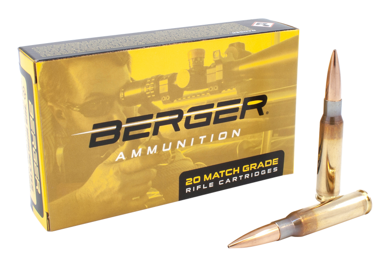 Berger Bullets 155.5 grain fullbore target ammunition in .308 Win with brass casing, designed for precision target shooting and competition. Delivers 3000 fps muzzle velocity and 3118 ft-lbs of energy. Sold in boxes of 20 rounds.