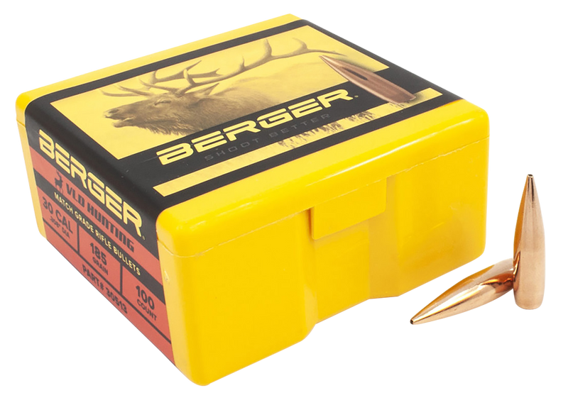 Berger VLD Hunting bullets are designed for long-range big game hunting with a very low drag profile and sharp nose that initiates expansion after 2-3 inches of penetration. These .308" diameter, 185-grain jacketed lead bullets feature a sectional density of .279 and are packaged 100 per box. Recommended for rifle hunting applications requiring match-grade precision and controlled expansion.