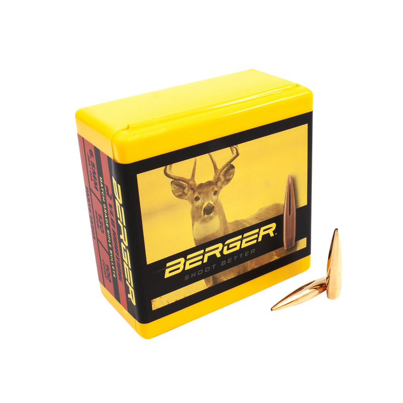 These Berger Match Grade VLD (Very Low Drag) Hunting bullets are designed for 6.5mm/.264" rifles and feature a sharp nose with slightly thinner jacket that initiates expansion after 2-3 inches of penetration. The 130-grain projectiles shed 40-85% of their weight as shrapnel upon expansion to maximize tissue damage on big game. Quantity is 100 bullets per box with an overall length of 1.324".