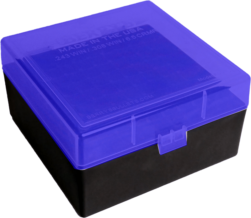 Berry's Model 87439 is a 100-round ammo storage box constructed from high-impact polypropylene for durability against cracking, chipping, and warping. Features a flip-top design with translucent blue lid and black base, stackable construction, and is made in the USA with a lifetime warranty.