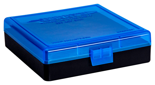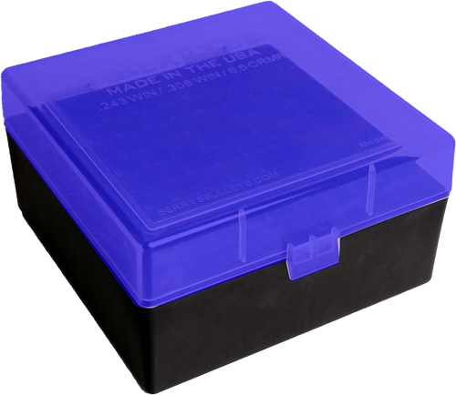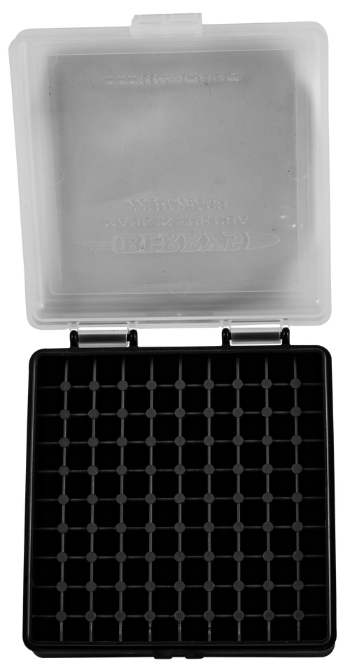 Berry's Model 25338 is a 100-round ammo storage box constructed from high-impact polypropylene with a clear lid and black base. Features a flip-top design with one-handed operation, stackable design, and a lifetime warranty. Made in the USA.