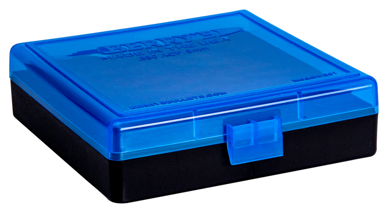 Berry's Model #001 ammo box is designed to safely store 100 rounds of 9mm or .380 ACP ammunition. Constructed from high-impact polypropylene with a translucent blue/smoke lid and black base, it features a stronger flip-top design with snap hinge for one-handed operation and is stackable for convenient storage.