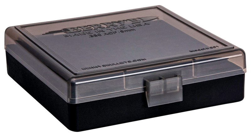 Berry's Model #001 ammo box is designed to safely store 100 rounds of 9mm or .380 ACP ammunition. Constructed from high-impact polypropylene with a translucent smoke lid and black base, it features a flip-top design for one-handed operation, is stackable, and carries a lifetime warranty.