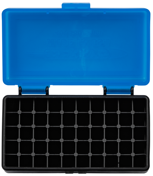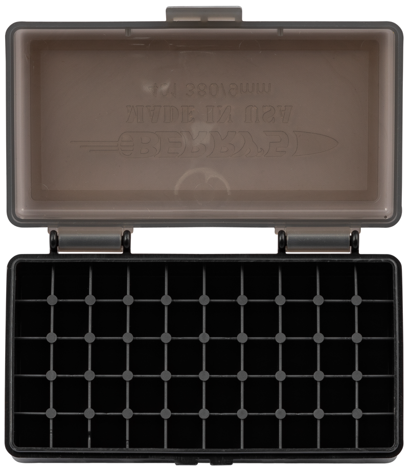 Berry's Model 19642 is a 50-round ammo box designed for 9mm and .380 ACP ammunition. Constructed from high-impact polypropylene with a translucent smoke lid and black base, it features a flip-top design with one-handed operation and is stackable for convenient storage.
