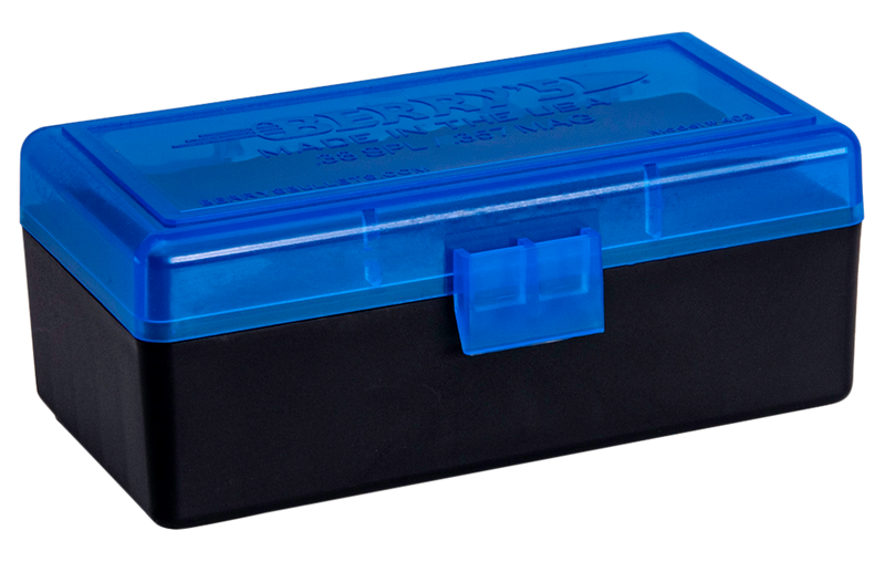 This Berry's Model #403 ammo box is designed to safely store .38 Special and .357 Magnum ammunition with a 50-round capacity. Constructed from high-impact polypropylene with a translucent blue lid and black base, it features a flip-top design with one-handed operation and is stackable for convenient storage.
