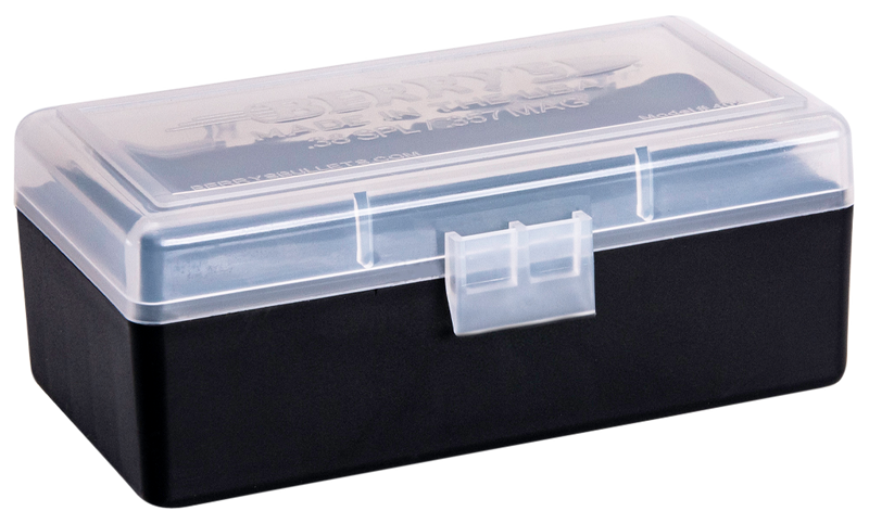 This Berry's ammo box is designed to safely store .38 Special or .357 Magnum ammunition with a 50-round capacity. Constructed from high-impact polypropylene with a translucent clear lid and black base, it features a flip-top design for easy one-handed operation and is stackable for convenient storage.