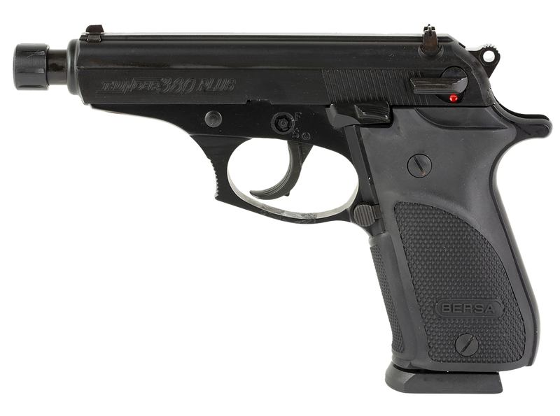 The Bersa Thunder 380 Plus is a double-action/single-action semi-automatic pistol chambered in 380 ACP with a 4.25" threaded barrel and 15+1 round capacity. Features include fixed 3-dot sights, micro-polished bore with deep rifling, manual safety with decocker, aggressive rear cocking serrations, and an alloy frame with matte black finish. Weighs 20.5 oz and measures 6.6" overall length.