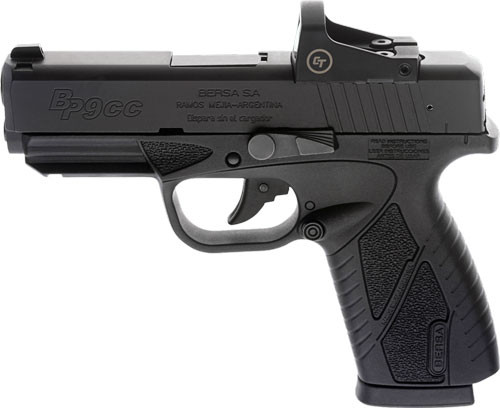 The Bersa BP CC is a striker-fired, semi-automatic compact pistol chambered in 9mm with a 3.3" barrel and 8-round capacity. Built on a lightweight polymer frame with a Picatinny rail for accessories, it features fixed sights, an amidextrous magazine release, and comes equipped with a Crimson Trace red dot sight for enhanced accuracy. Designed for personal protection and concealed carry with an ergonomic, ultra-thin profile.