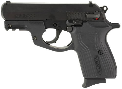 The Bersa BP380MCC is a striker-fired semi-automatic pistol chambered in .380 ACP with a 3.3" barrel and 8+1 round capacity. Features include a polymer frame with Picatinny rail, matte black finish, interchangeable sights, and ambidextrous controls, weighing 21.5 oz. Designed for concealed carry with high-impact polymer construction and micro-polished bore.